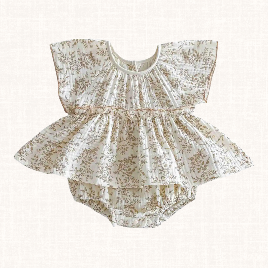 Light as a breeze and full of charm, this two-piece romper set features a delicate botanical print and layered silhouette. A soft and elegant choice for warm, cozy days.