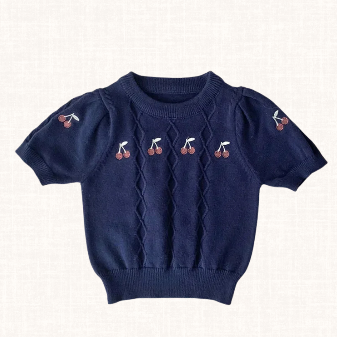 Sweet and cozy, this cherry-embroidered sweater combines the soft texture of knitwear with a cheerful vintage touch. Perfect for cooler days, keeping your little one stylish and warm.