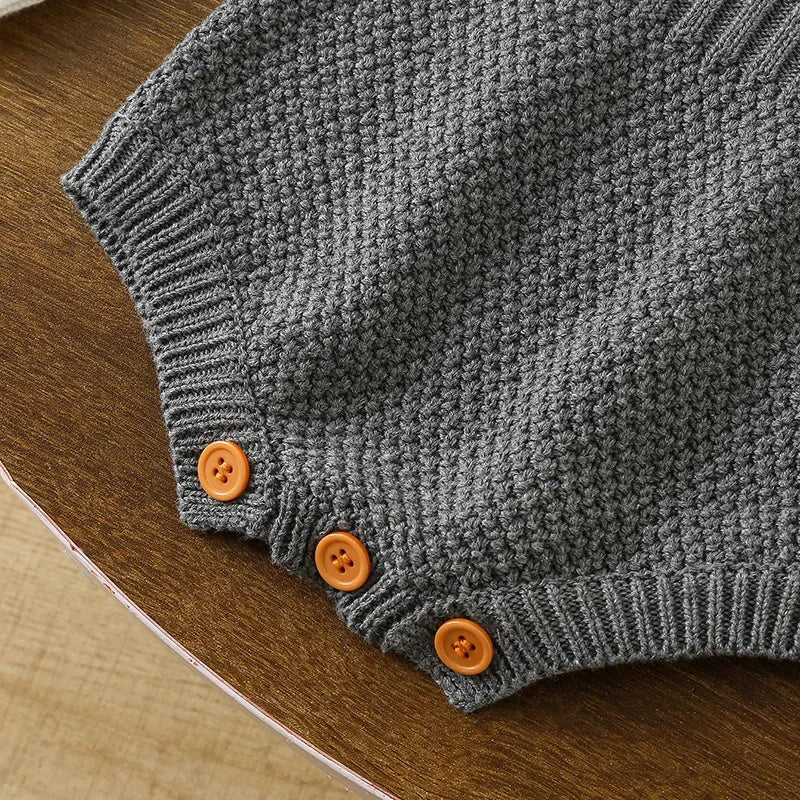 Clémentine is a cozy knitted romper with a ruffled collar and a two-tone design, available in elegant gray or festive red. Its soft texture and button details make it both practical and charming for everyday wear or special occasions.