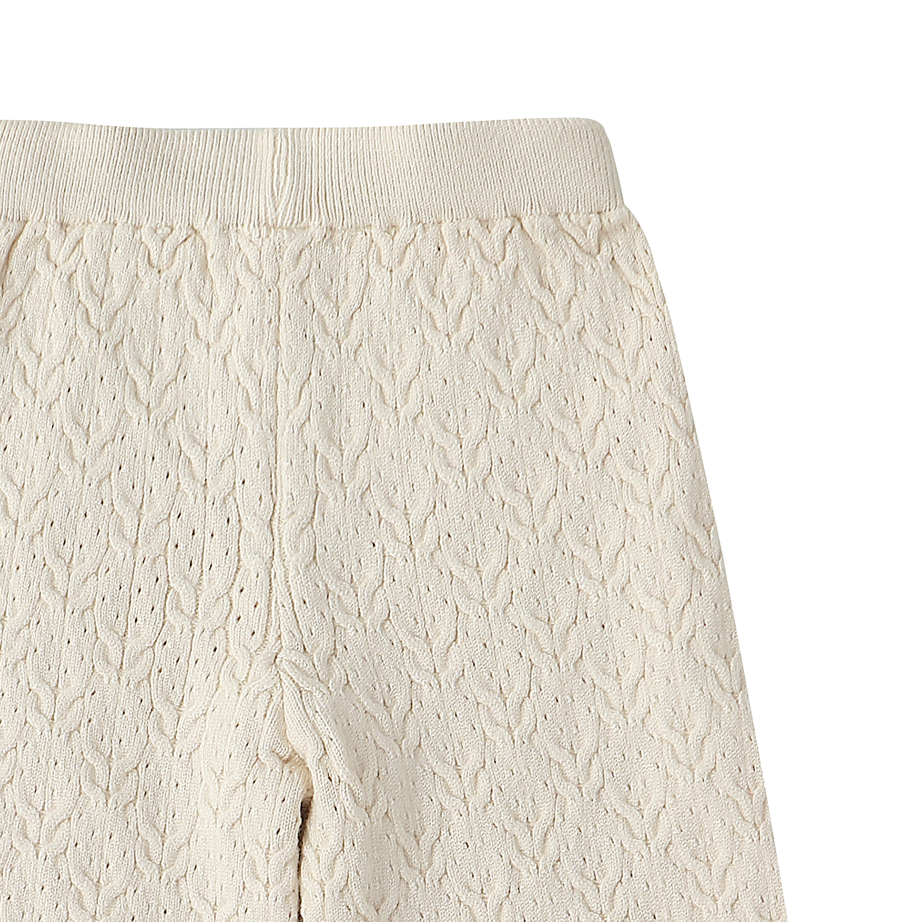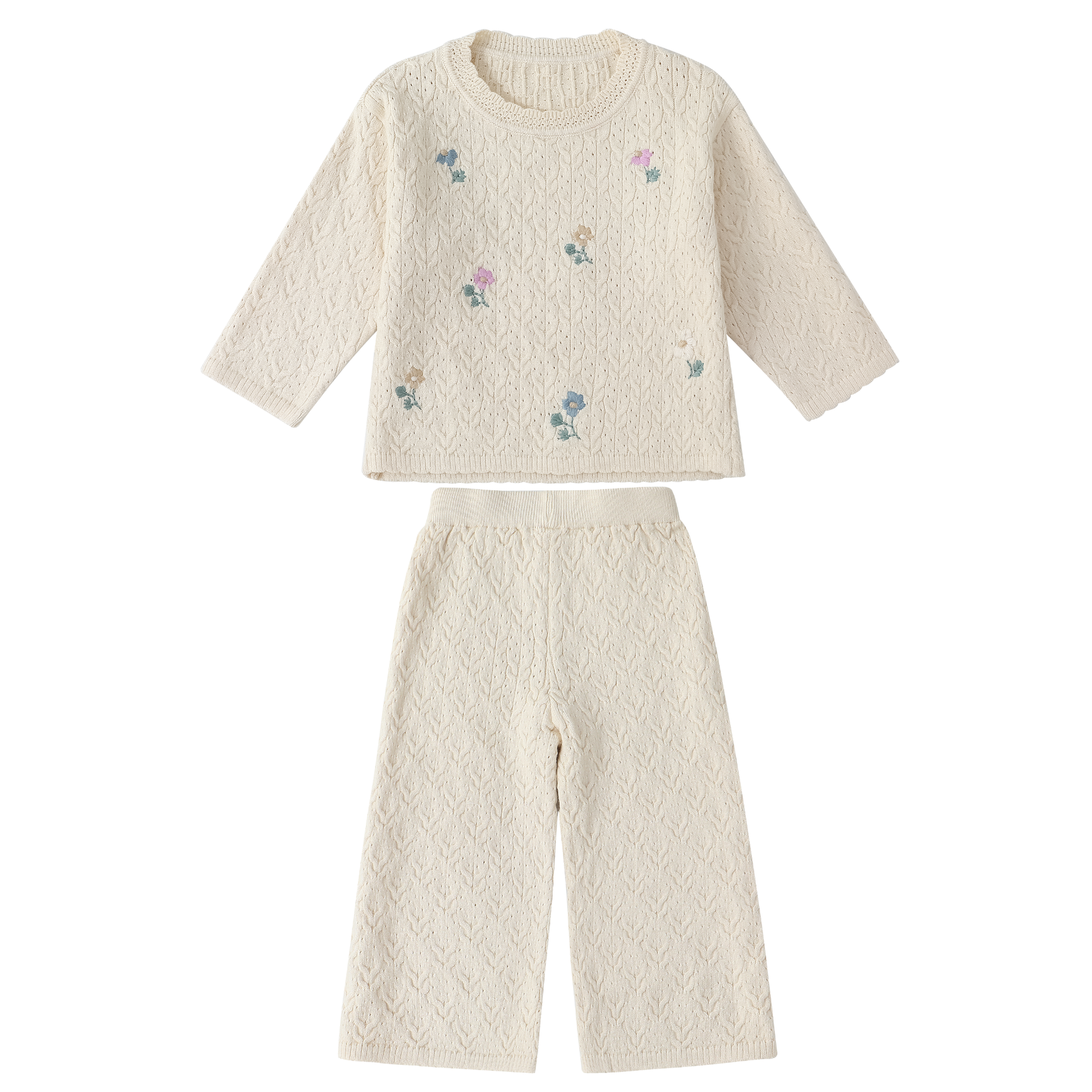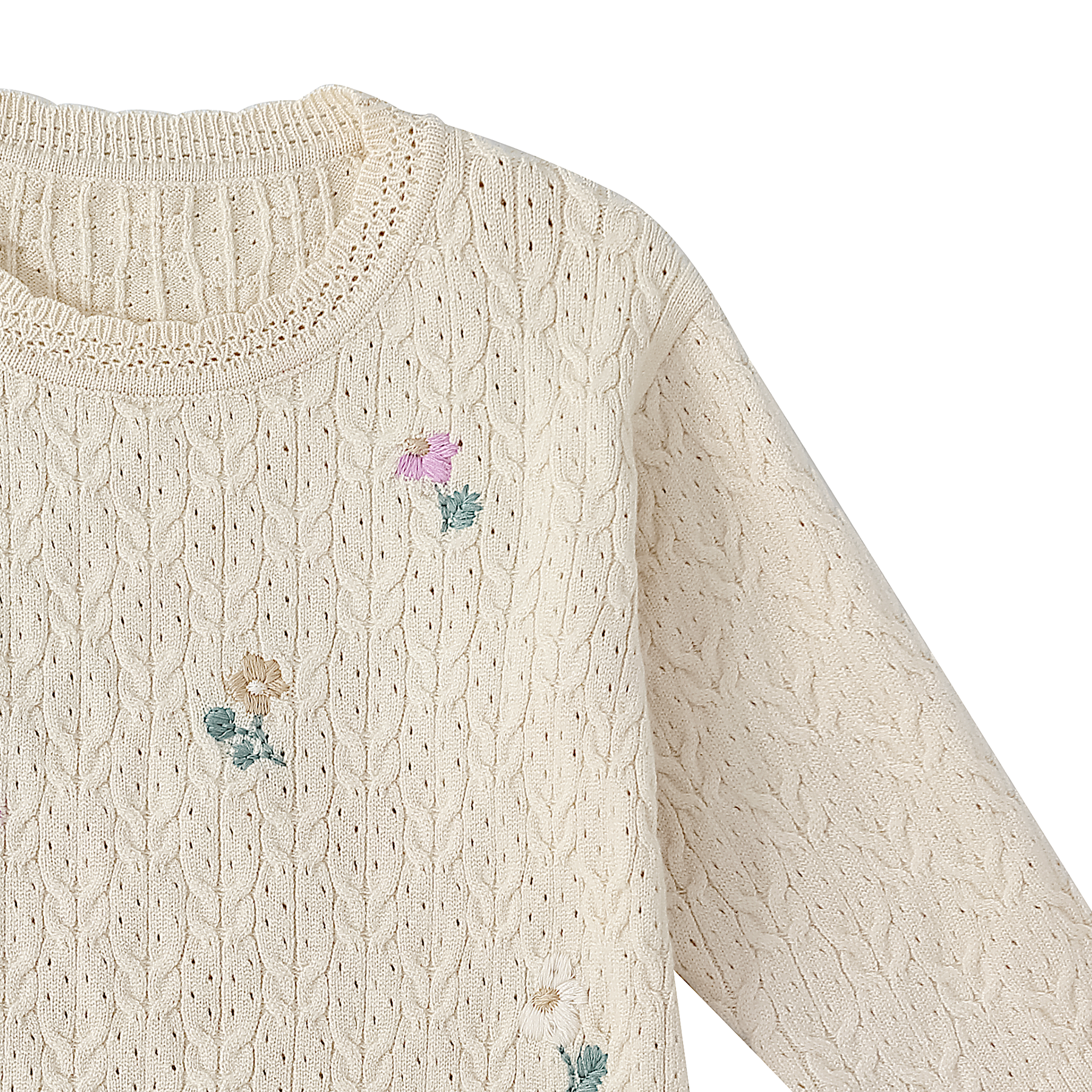 Soft open-knit cotton with pastel floral embroidery