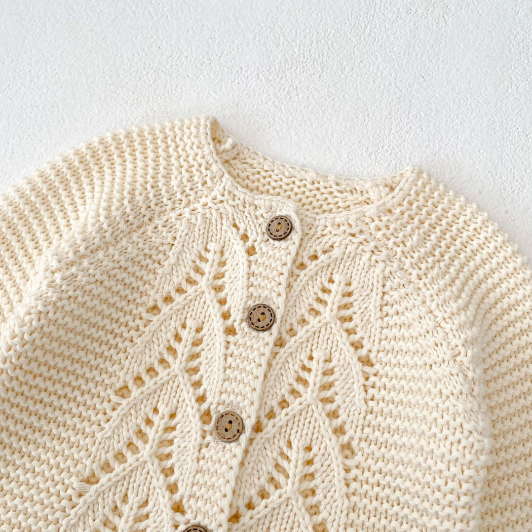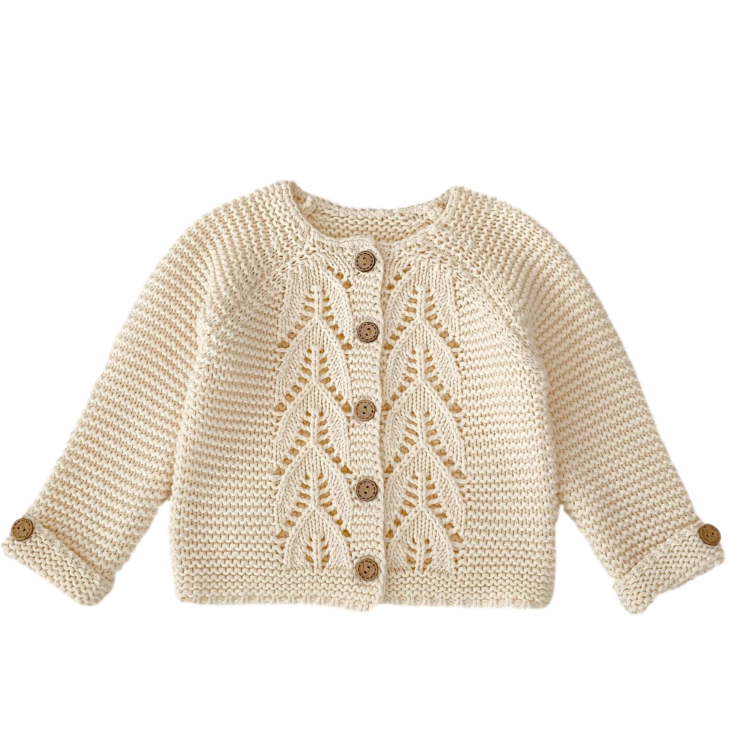 A cozy and timeless layer for cooler days. The Oat Leaf Knit Cardigan features a delicate openwork leaf pattern on the front and a soft textured knit that brings warmth and charm to every outfit. Its natural beige tone makes it easy to pair and perfect for everyday wear.