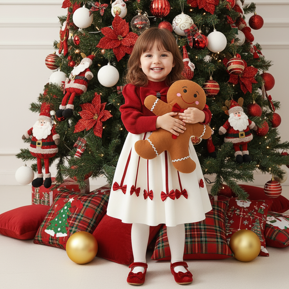A festive knit dress that captures the magic of the season. With a rich red bodice, puffed sleeves, and a flared ivory skirt adorned with dainty red bows, this piece is designed for memorable celebrations and timeless photographs.