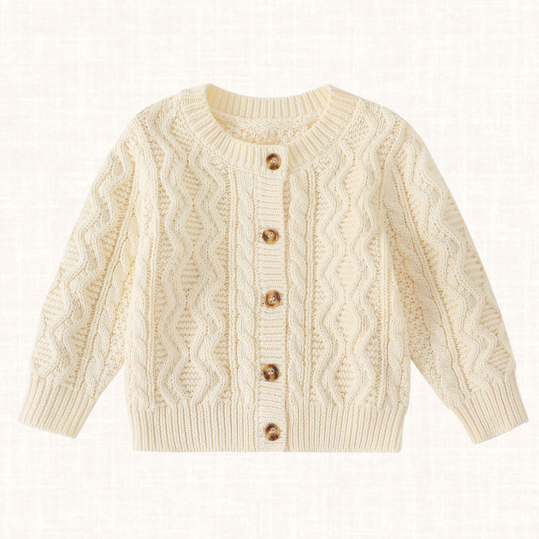 Thoughtfully knitted in a delicate cable pattern, the Henry Cable Cardigan brings quiet elegance to your little one’s everyday style. Its soft texture and timeless design make it a refined essential for colder days, while the natural wood-style buttons add a warm, traditional touch.