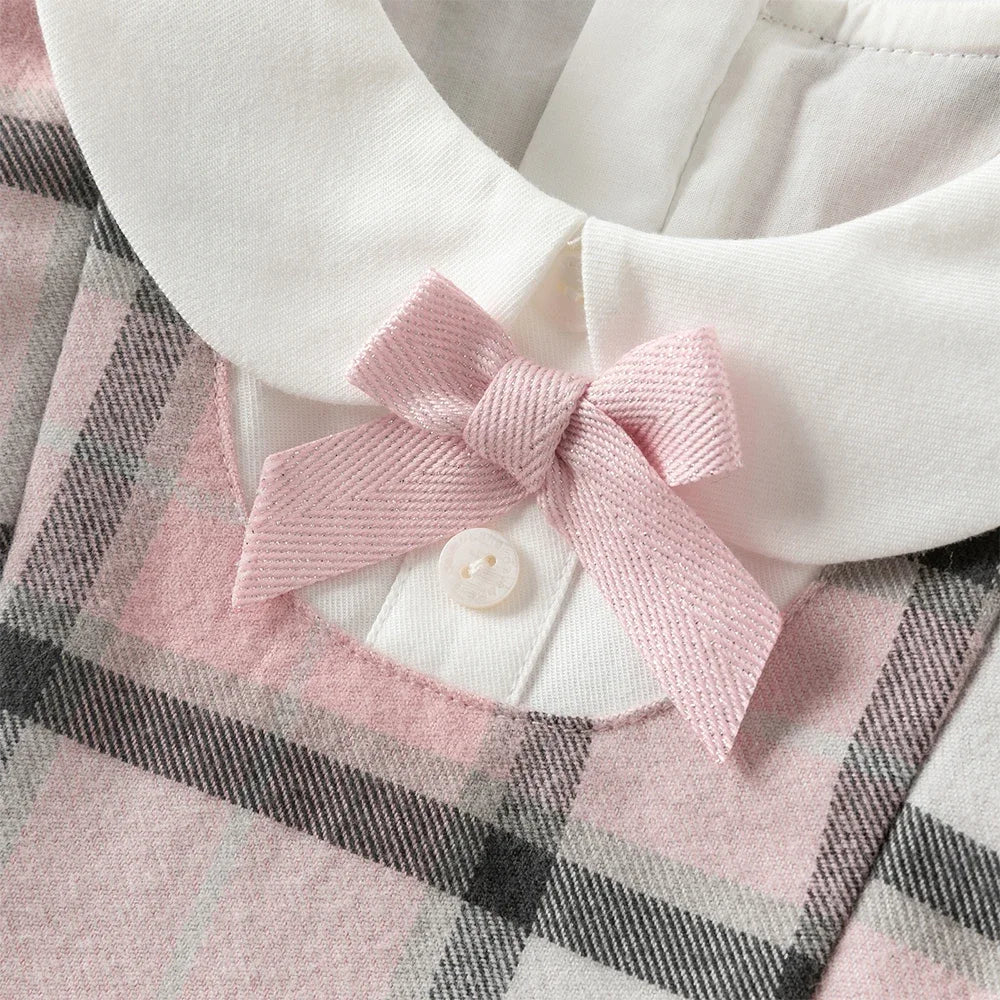 Margot is a charming plaid dress in soft pink and gray, paired with a crisp white blouse and peter pan collar. Finished with a bow and a sweet bunny detail, it blends playfulness with timeless elegance.