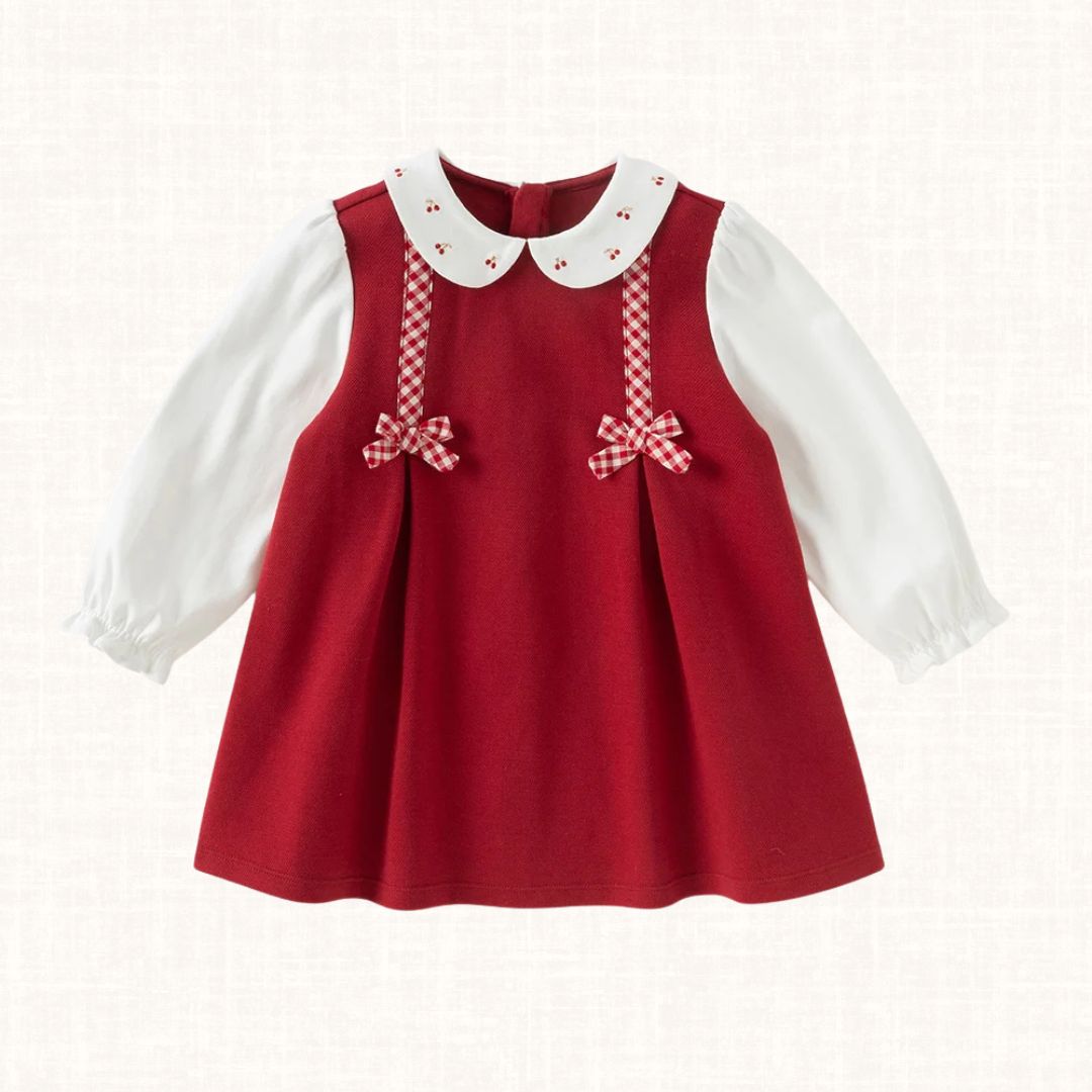 A delightful one-piece dress that combines classic charm with playful touches. The embroidered collar and gingham bows add sweetness to the rich red fabric, while the soft long sleeves ensure comfort for cooler days. A perfect blend of elegance and joy.