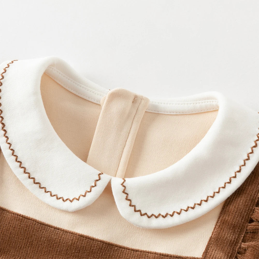 A warm and charming one-piece dress crafted in soft corduroy, adorned with delicate floral embroidery on the chest. The ruffled straps and Peter Pan collar add a timeless touch, making it perfect for both everyday elegance and special occasions.