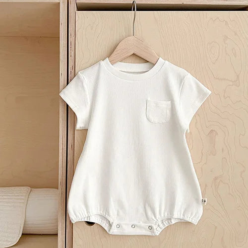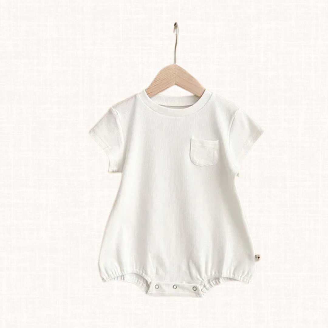 Soft ribbed sleepsuit with short sleeves and front pocket. Snaps at the bottom for easy changing.
