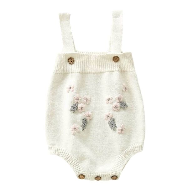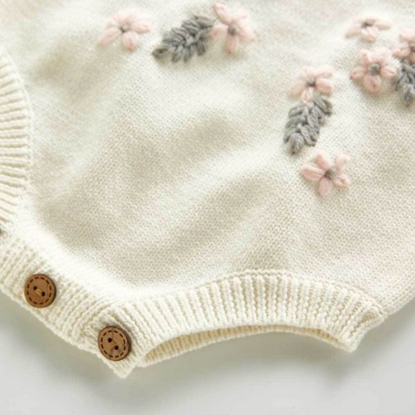 Violette is a soft knit romper in warm ivory, beautifully adorned with pastel floral embroidery and wooden button details. Cozy, poetic and timeless, it’s a sweet choice for cool days, first photos and everyday charm.