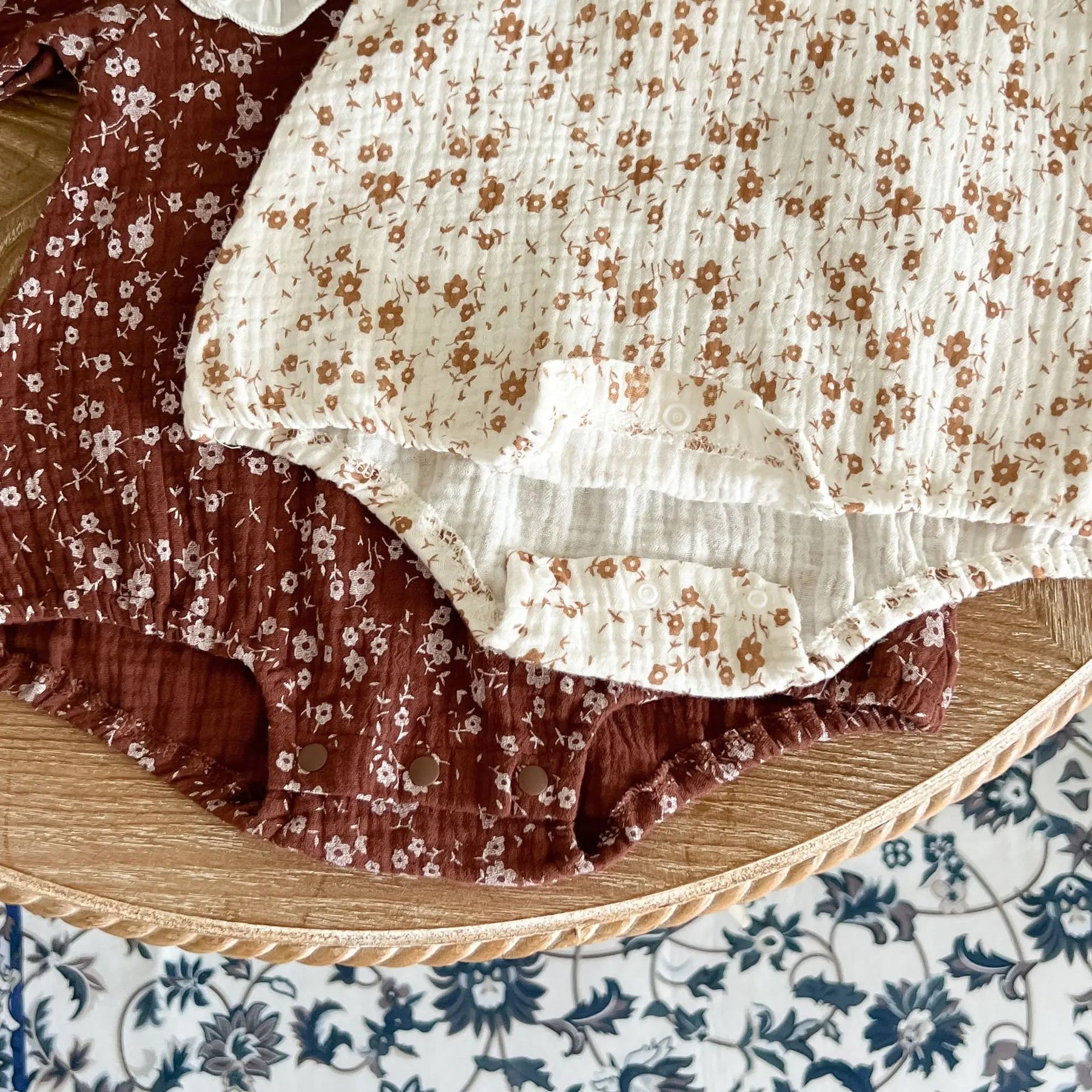 Delphine is a charming floral romper available in cream or rust tones, featuring puff sleeves and a crisp white ruffled collar. Light, elegant, and comfortable, it’s a timeless piece for everyday wear or special moments.