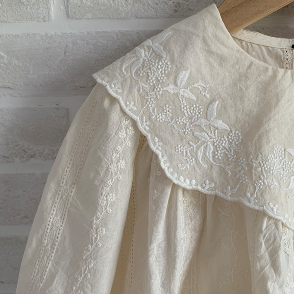 Madeleine is an ecru romper in delicate broderie anglaise, framed by a cape-style embroidered collar and puffed sleeves. With its vintage charm and gentle comfort, it’s a timeless piece for both everyday sweetness and special occasions.