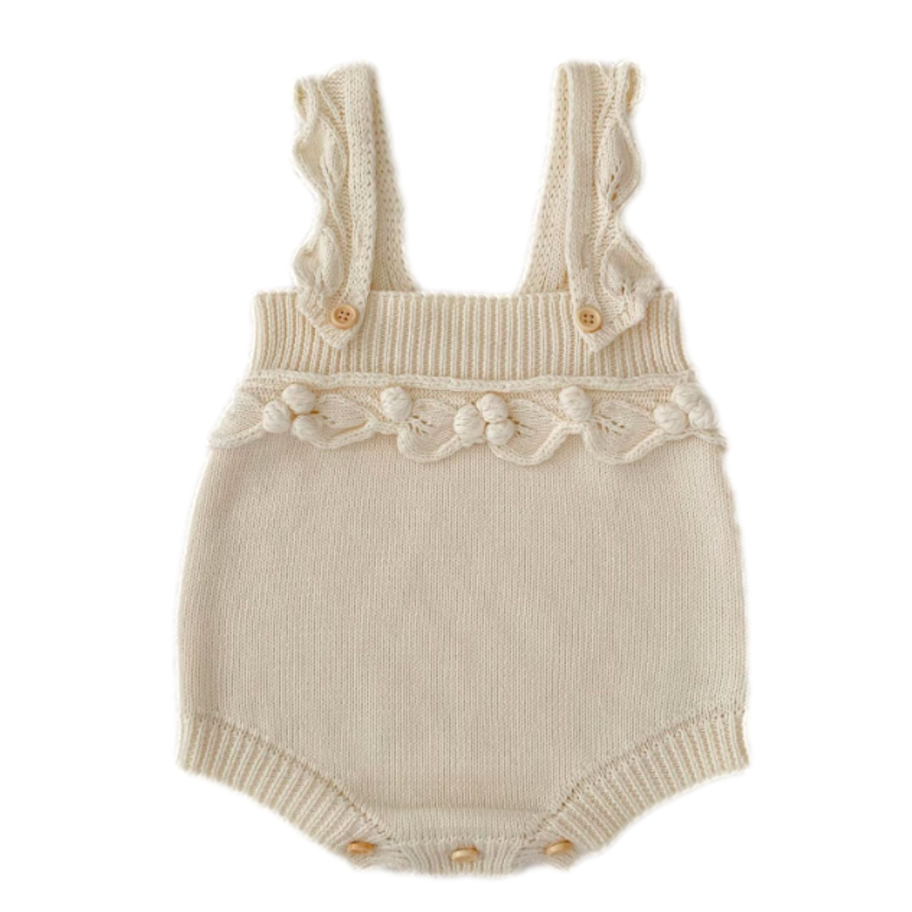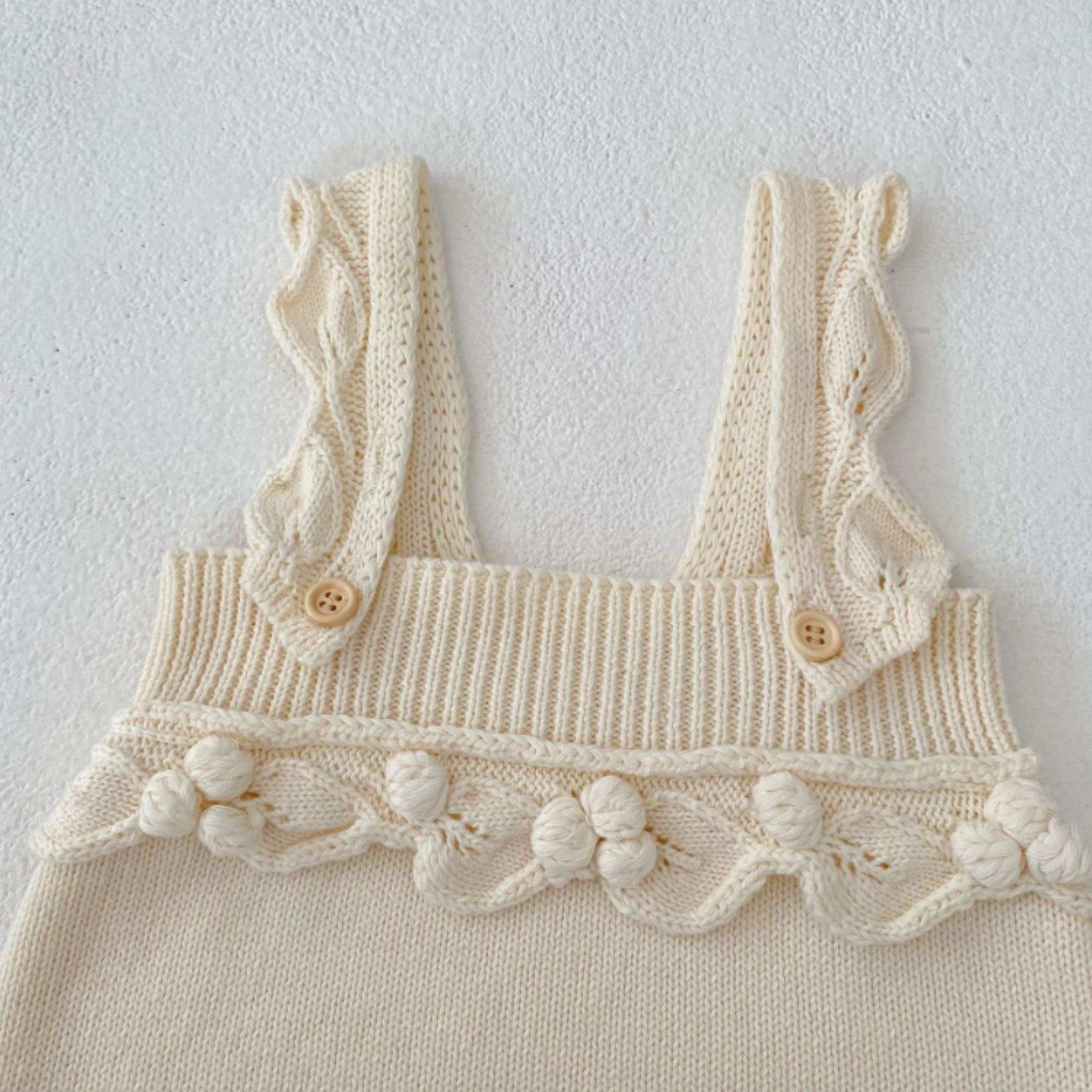 Noémie is a delicate ivory knit romper featuring soft ruffled straps and a handcrafted floral trim. Lightweight, charming and beautifully textured, it’s a timeless piece for first memories, photos and sweet everyday moments.