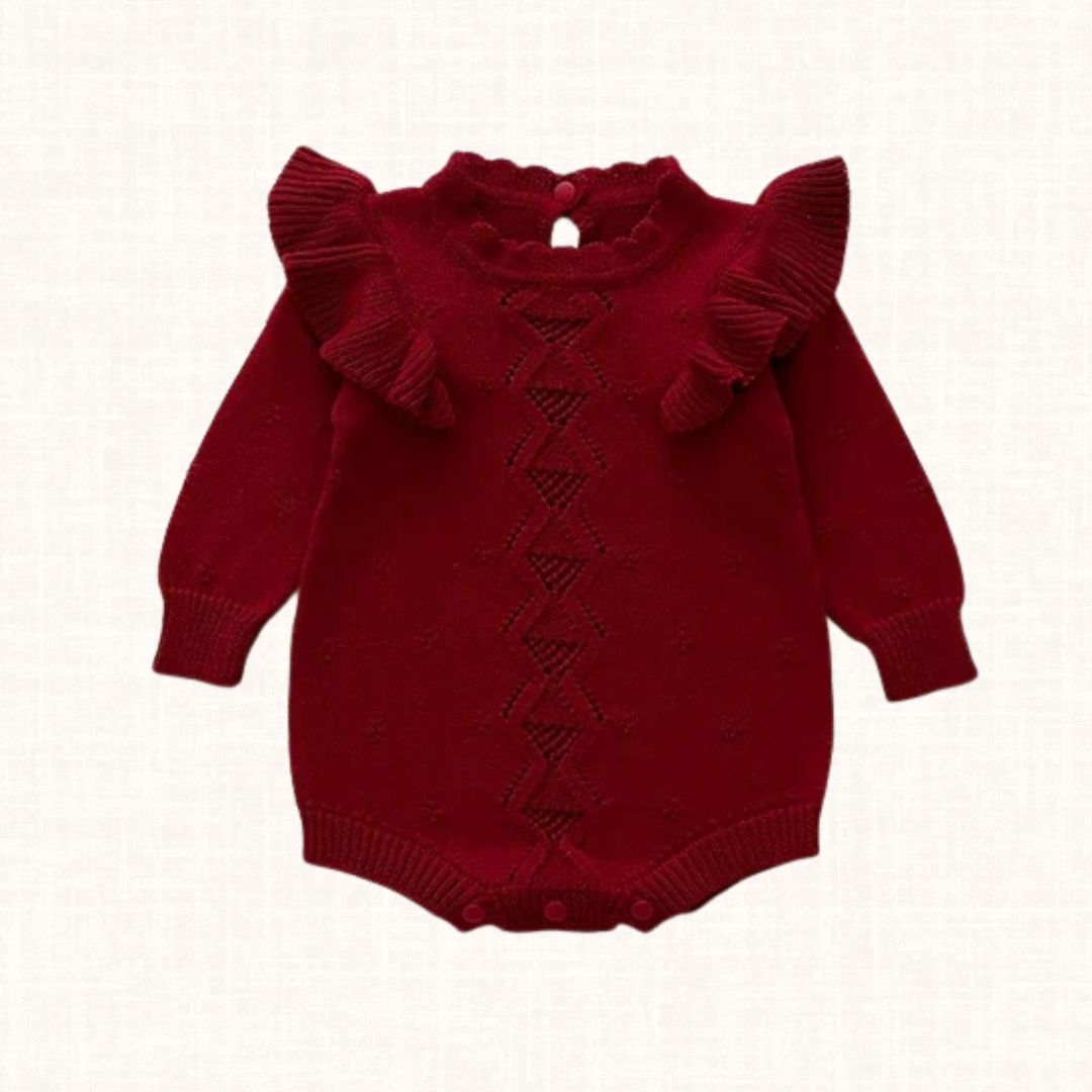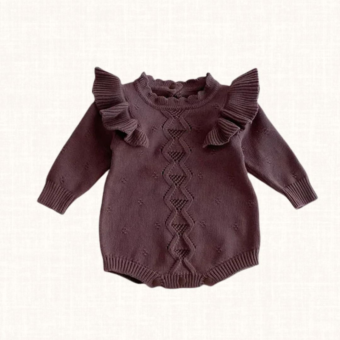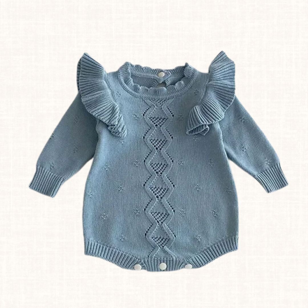 Aveline is a delicate ivory knit romper crafted to feel soft, warm and timeless. The intricate central knit pattern creates subtle texture, while the graceful ruffled shoulders add a romantic statement to the silhouette. Tiny embroidered dot details bring charm and refinement, making this piece both elegant and tender. Designed to wrap little ones in comfort, it is perfect for cooler days, family gatherings and cherished quiet moments.