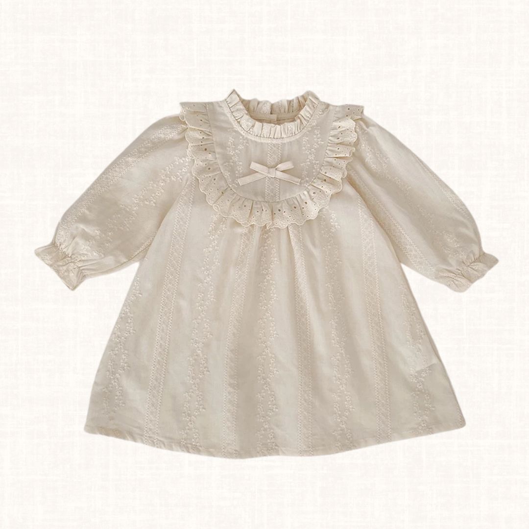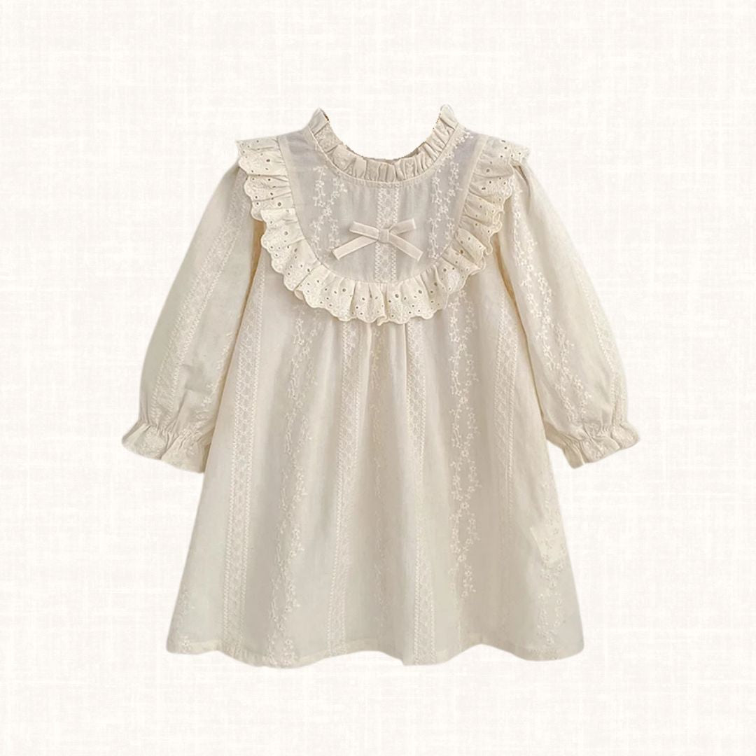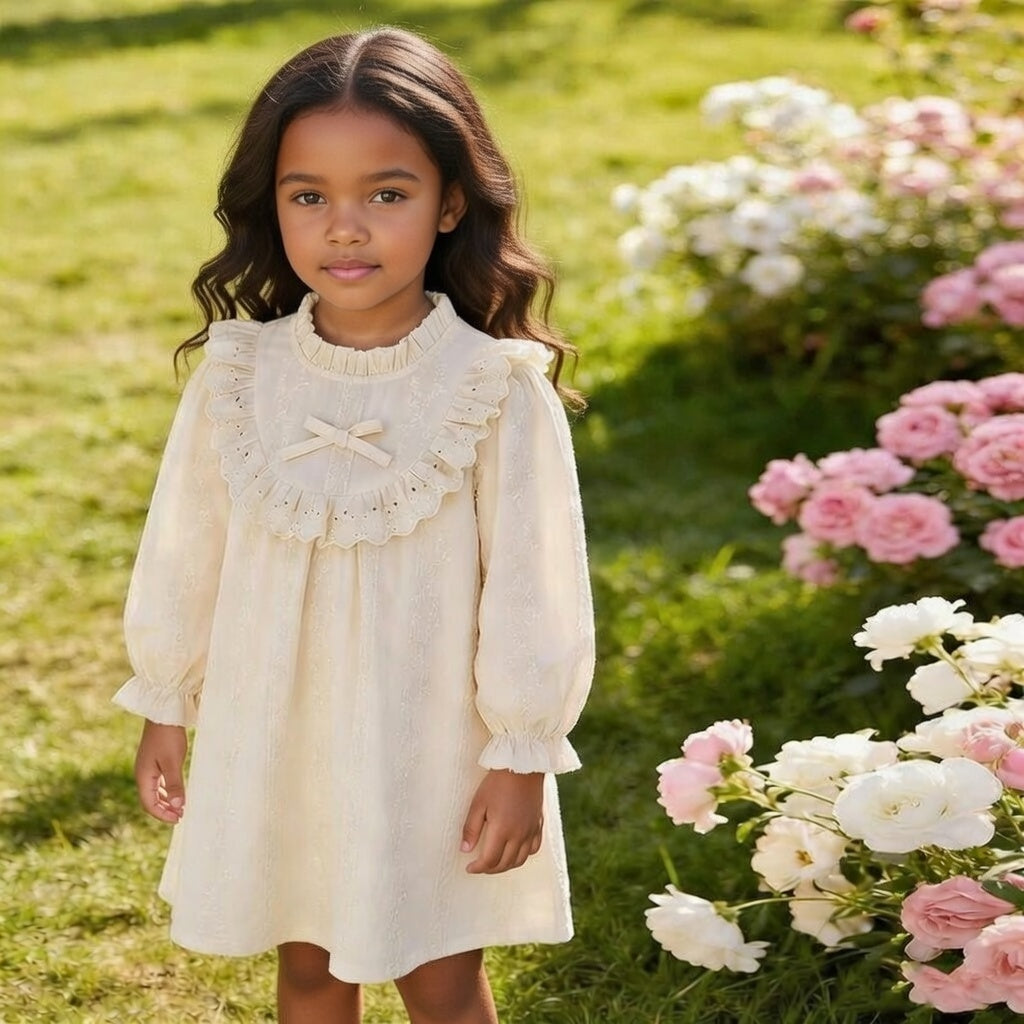 Celestine is a delicate ivory dress inspired by timeless heirloom pieces. Crafted in softly textured cotton with subtle embroidered details, it features a beautifully layered ruffle bib adorned with eyelet finishes and a satin bow at the center. The gently gathered neckline and flowing silhouette create graceful movement, while the long sleeves with ruffled cuffs add an extra touch of tenderness. A refined piece made for celebrations, portraits and the sweetest childhood memories.