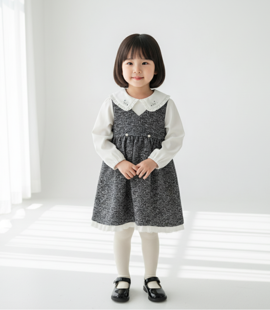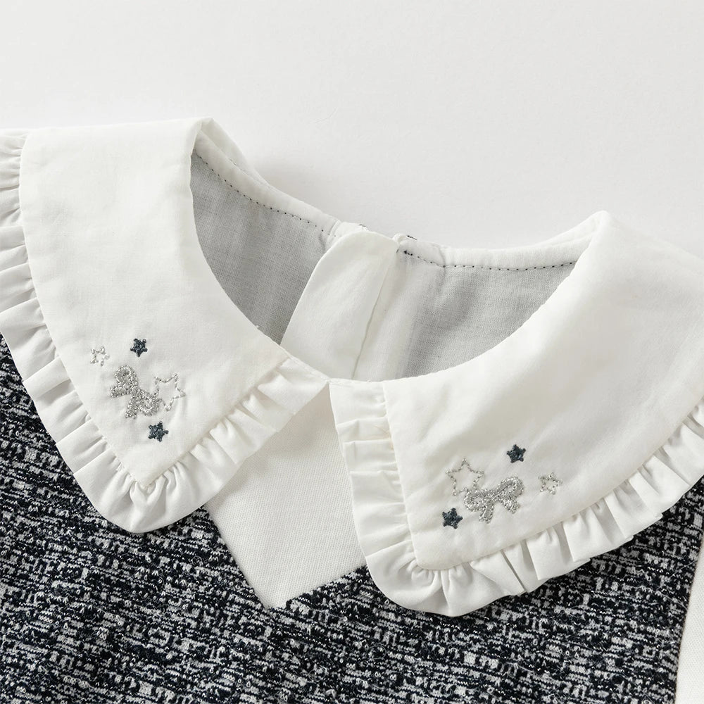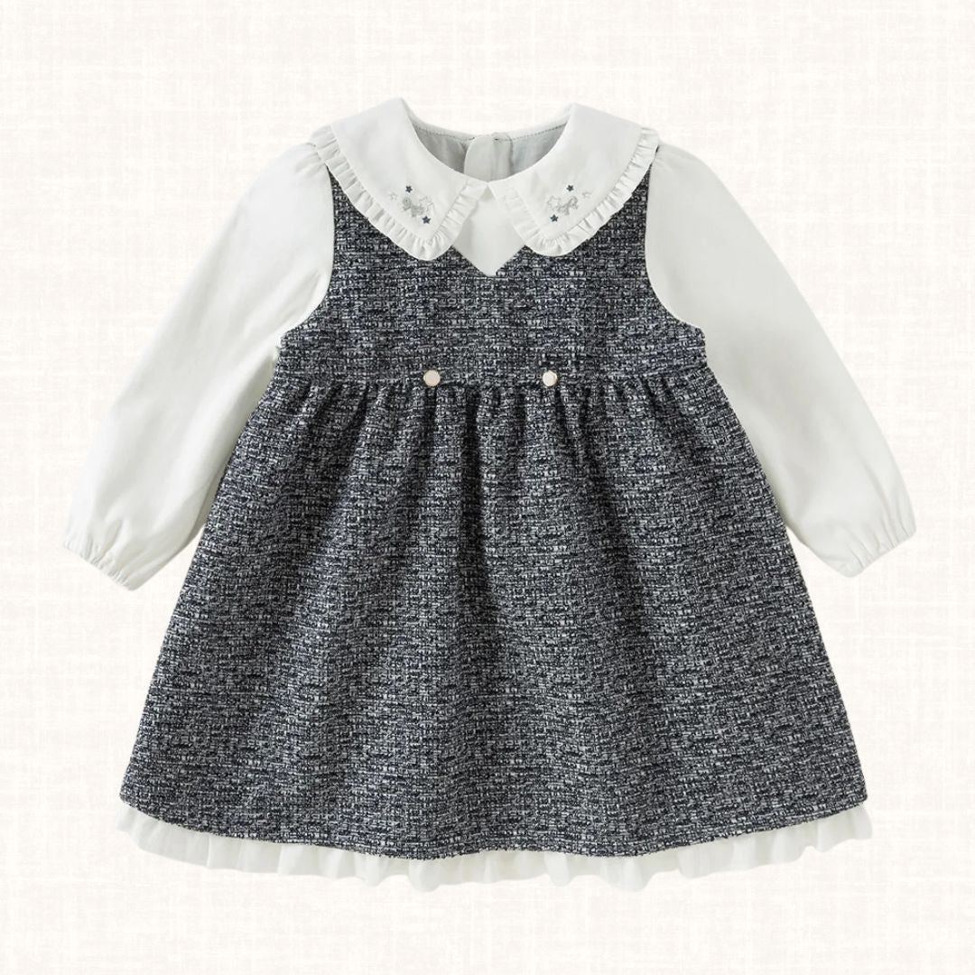 A sophisticated one-piece dress designed to look like a layered set. The soft tweed-effect fabric blends beautifully with the long sleeves and embroidered collar, creating an elegant silhouette full of charm. Comfortable and refined, it is perfect for both festive gatherings and stylish everyday wear.