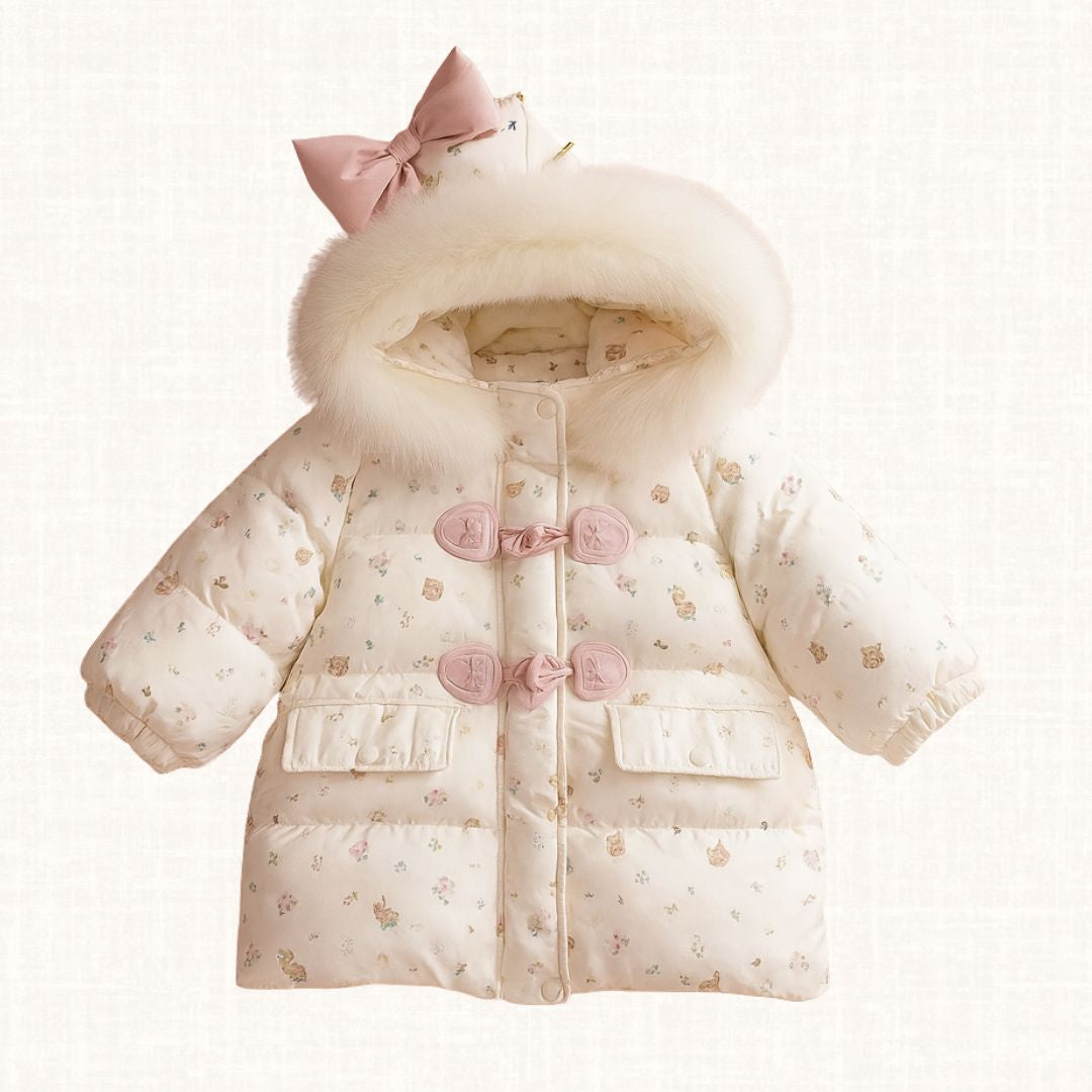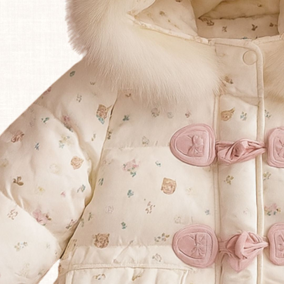Its delicate print, paired with soft pastel accents and plush fur-like trim, creates a look that feels thoughtful, sweet and quietly refined.