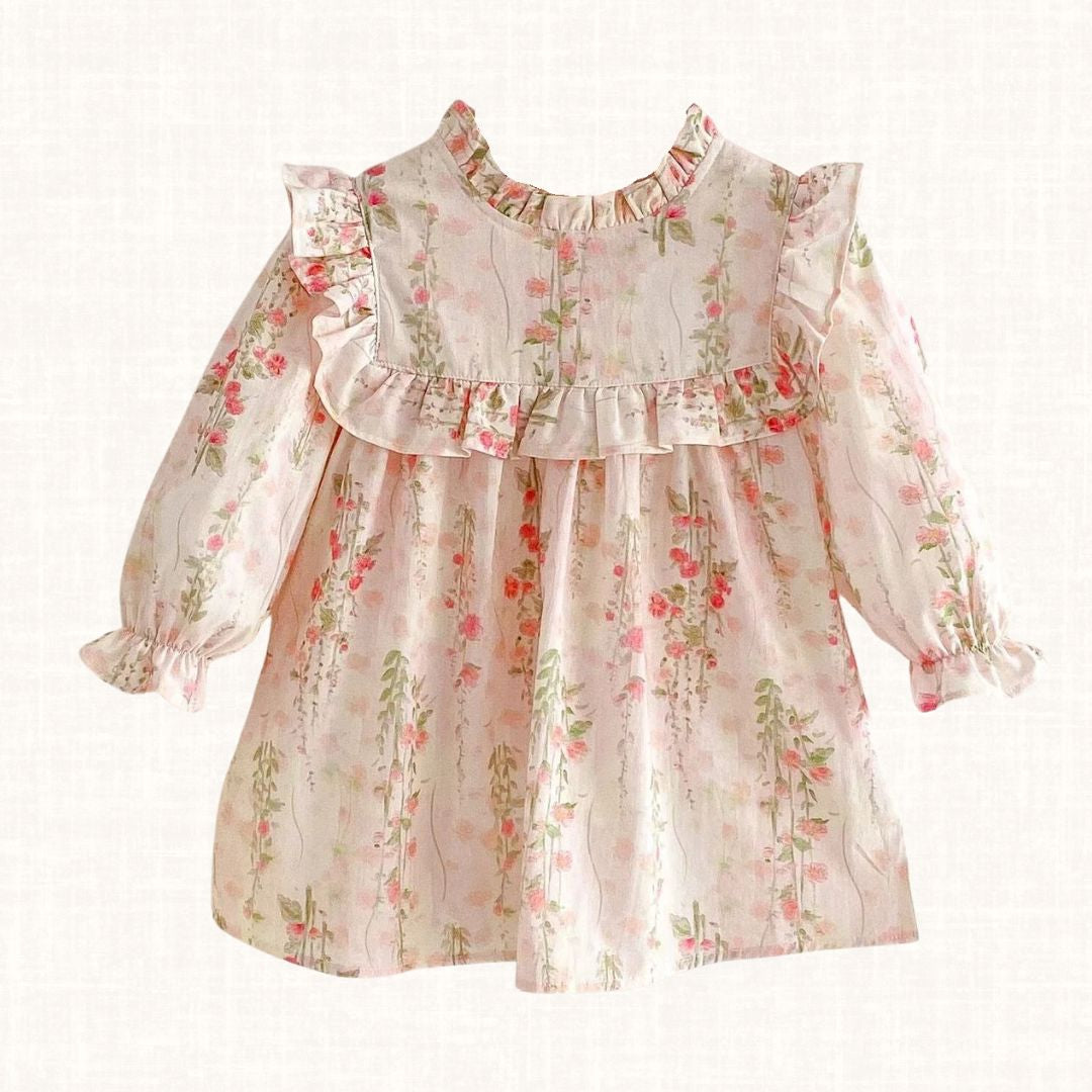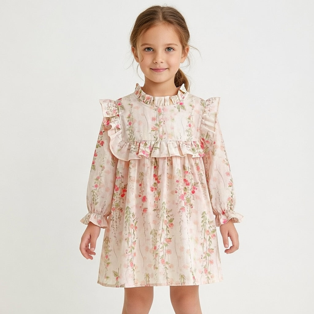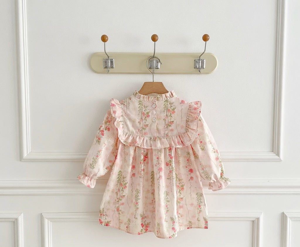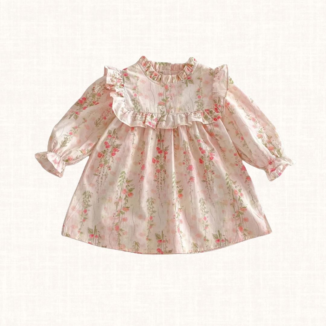 Florentine is a soft blush floral dress that feels like a gentle spring morning. Crafted in lightweight cotton with delicate scattered blooms, it features a beautifully structured bib trimmed with romantic ruffles that frame the silhouette with grace. The softly gathered neckline and flowing skirt create effortless movement, while the long sleeves with subtle elastic cuffs ensure comfort throughout the day. A poetic piece made for garden walks, family gatherings and the sweetest little celebrations.