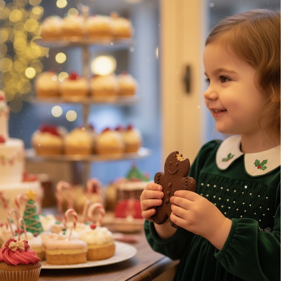 A refined velvet dress with hand-smocked details and an embroidered Peter Pan collar. Available in deep green and festive red, it captures the magic of Christmas with elegance and softness.
