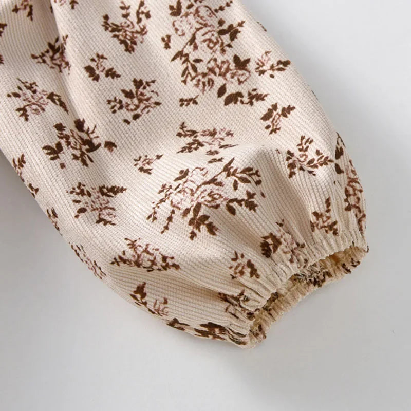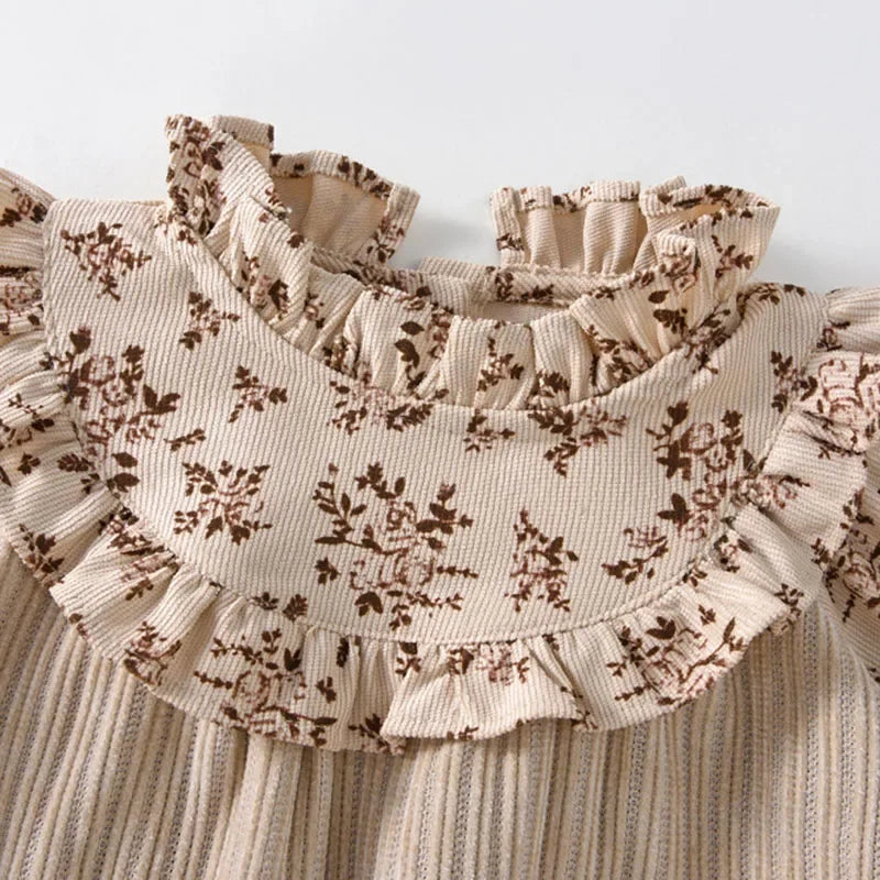 Noémie is a lovely romper with a ribbed beige body, floral puff sleeves, and a ruffled neckline for a touch of vintage charm. Soft and breathable, it’s perfect for playful days while keeping little ones elegant and comfy.