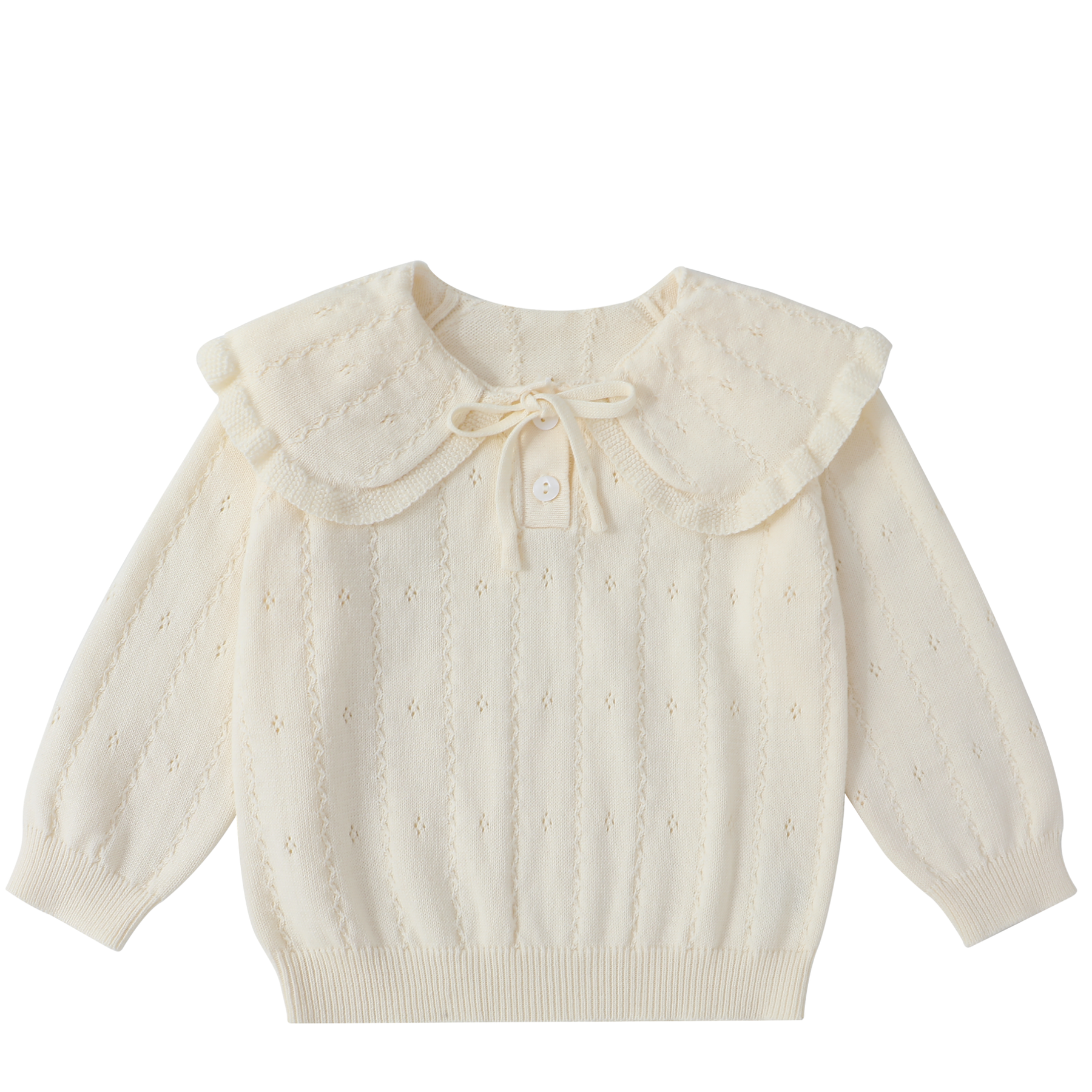 A poetic knit for the cooler days — the Adele Sweater pairs a rich bordeaux hue with a beautifully ruffled collar and a delicate tie-front bow. Its soft openwork knit brings subtle texture and charm, making it an elegant essential for the season.